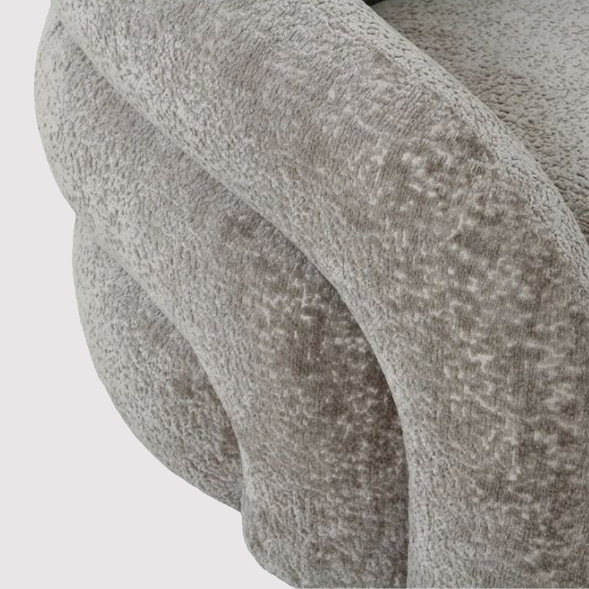 Design Features: The rounded shape of the Armchair Valletta features smooth, continuous lines that give it a sculptural and modern appearance. The natural color of the fabric offers a neutral yet warm tone, making it versatile enough to suit a variety of décor styles.