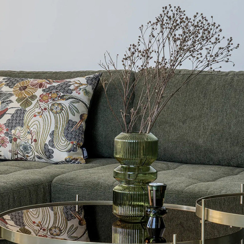 Elevate your home decor with the Vase Arejo, a sophisticated glass piece that blends modern design with timeless charm. Its sculptural silhouette and ribbed texture create a stunning visual effect, making it a perfect centerpiece for any space.
